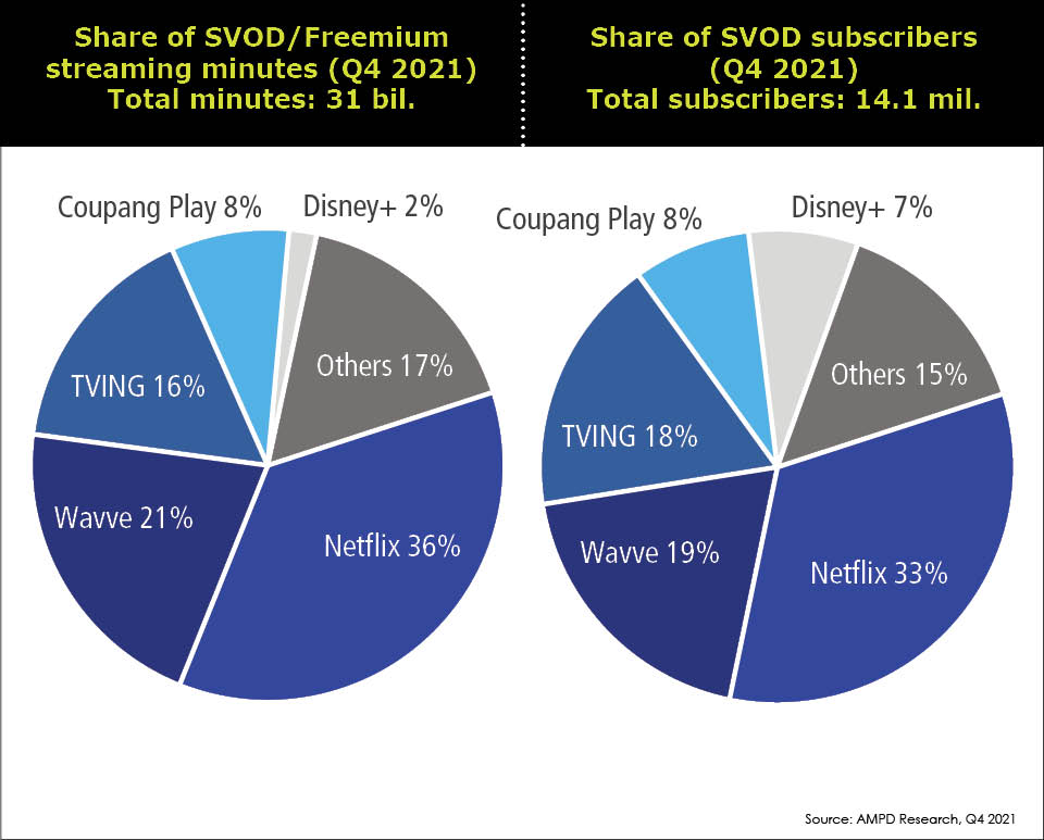 South Korea’s SVOD subscriptions hit 14.1 million in Q4 2021, with Netflix at the head of the pack followed by three local platforms – Wavve, TVing…