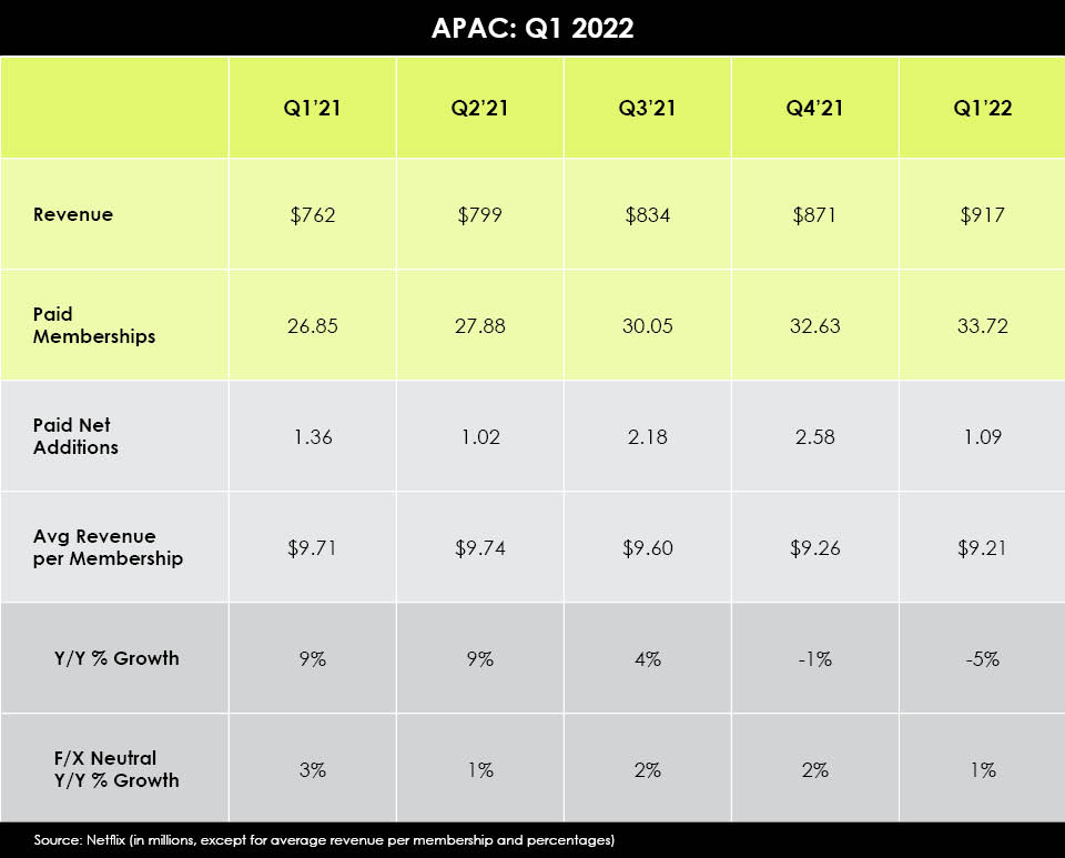 Netflix increased paid memberships in Asia Pacific to 33.72 million at the end of March this year – an increase of 1.09 million from end-Dec 2021 but…