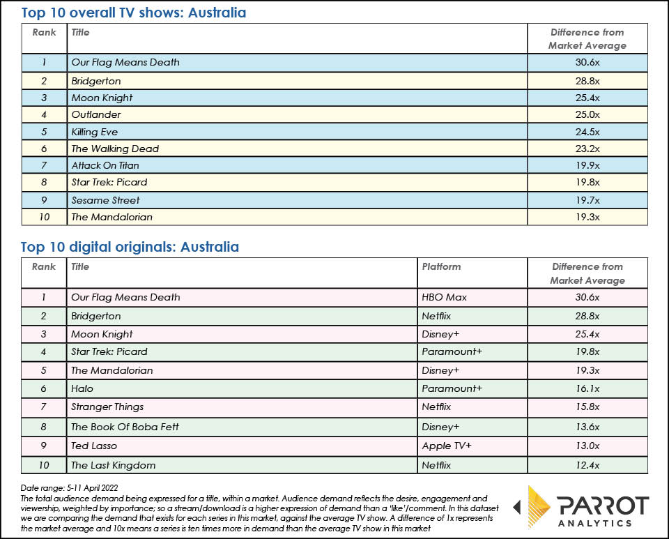 Streaming originals ruled demand in Australia for the week of 5-11 April, with HBO Max in the lead with pirate comedy "Our Flag Means Death" (…