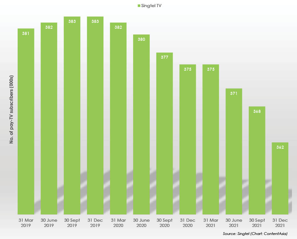 Singtel followed StarHub down Singapore’s disappearing pay-TV subs drain, ending 2021 at 362,000 residential subscribers, down 3.5% from 375,000 in…