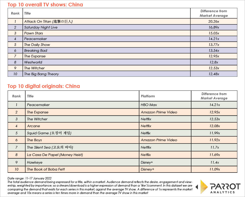Japanese anime blockbuster "Attack on Titan" and HBO Max’s "Peacemaker" topped China’s list of most in-demand programmes for the week of 11-17…