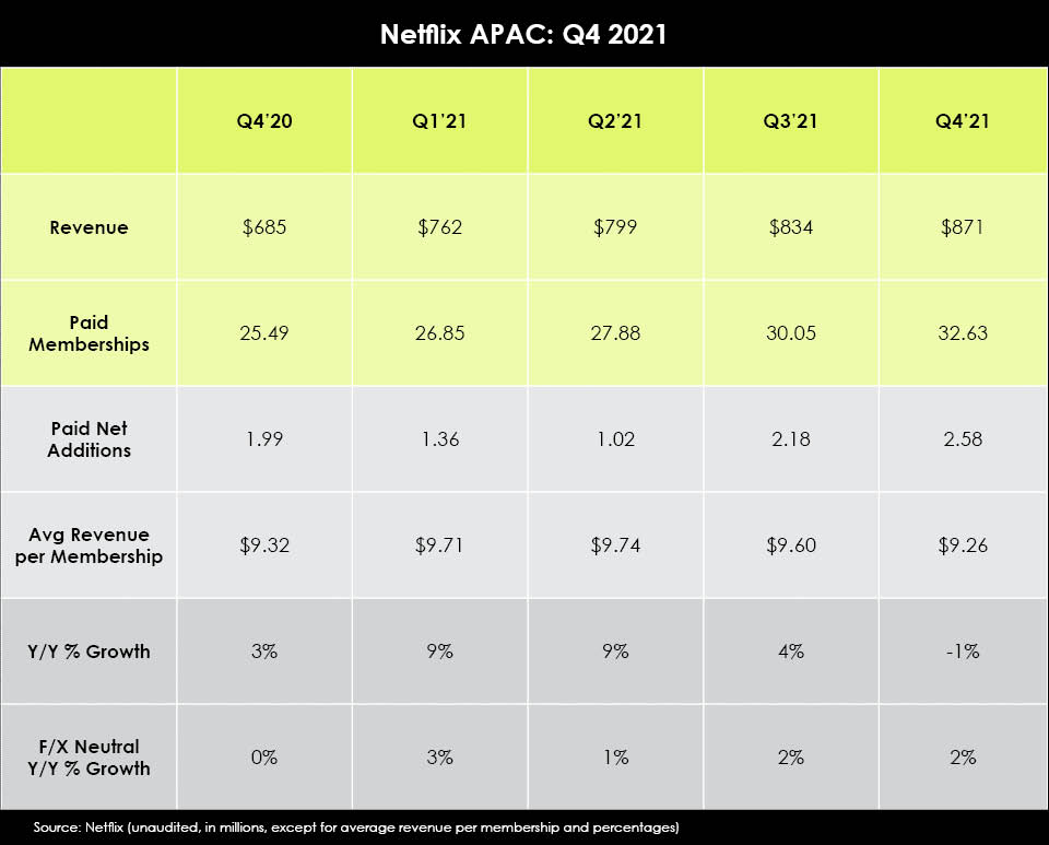Netflix's average revenue per member for Q4 2021 in Asia Pacific dropped to its lowest levels in five quarters to US$9.26 on the highest number of…