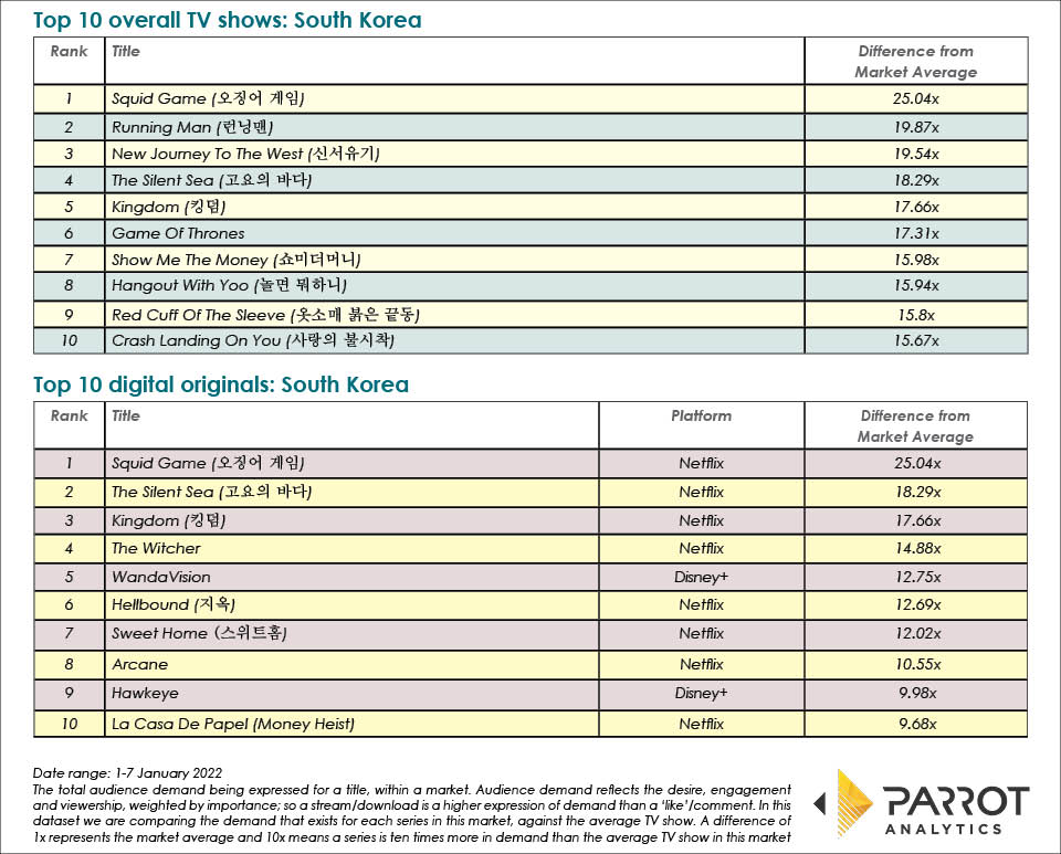 Netflix swept streaming favourites in Korea for the first week of 2022, taking eight of the top 10 spots for shows most in demand in the country.…