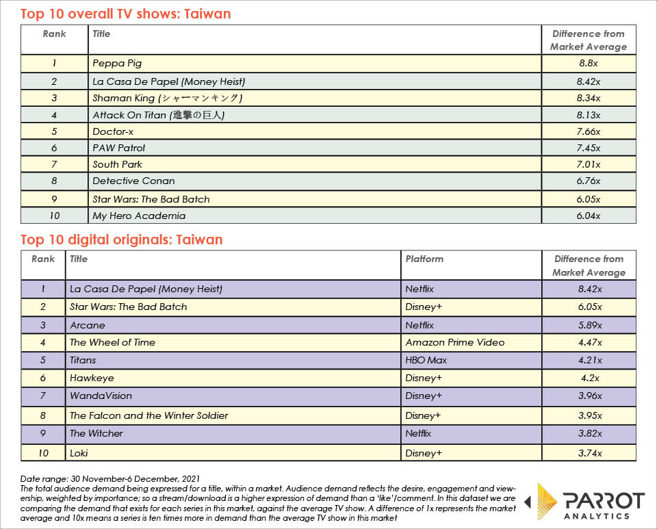 Hasbro’s "Peppa Pig" pushed Netflix’s Money Heist into second place in Taiwan for the week of 30 November to 6 December on an overall list that shows…