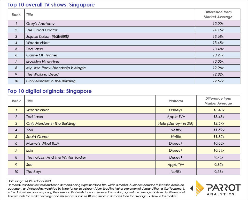 Singapore’s digital demand was all about Disney+ for the week of 13-19 Oct, although the streaming giant’s "WandaVision" shared top spot on Parrot…
