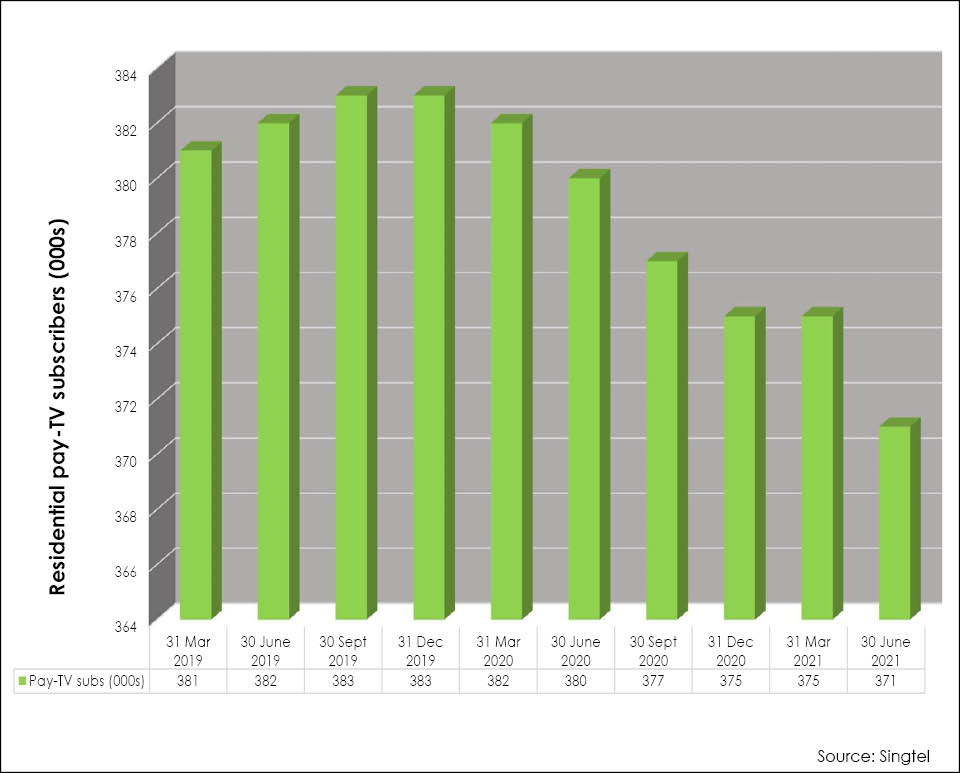 Singtel’s residential pay-TV subscribers in Singapore dropped 2.2% over the year to end June, ending at 371,000 homes from 380,000 in June last year…