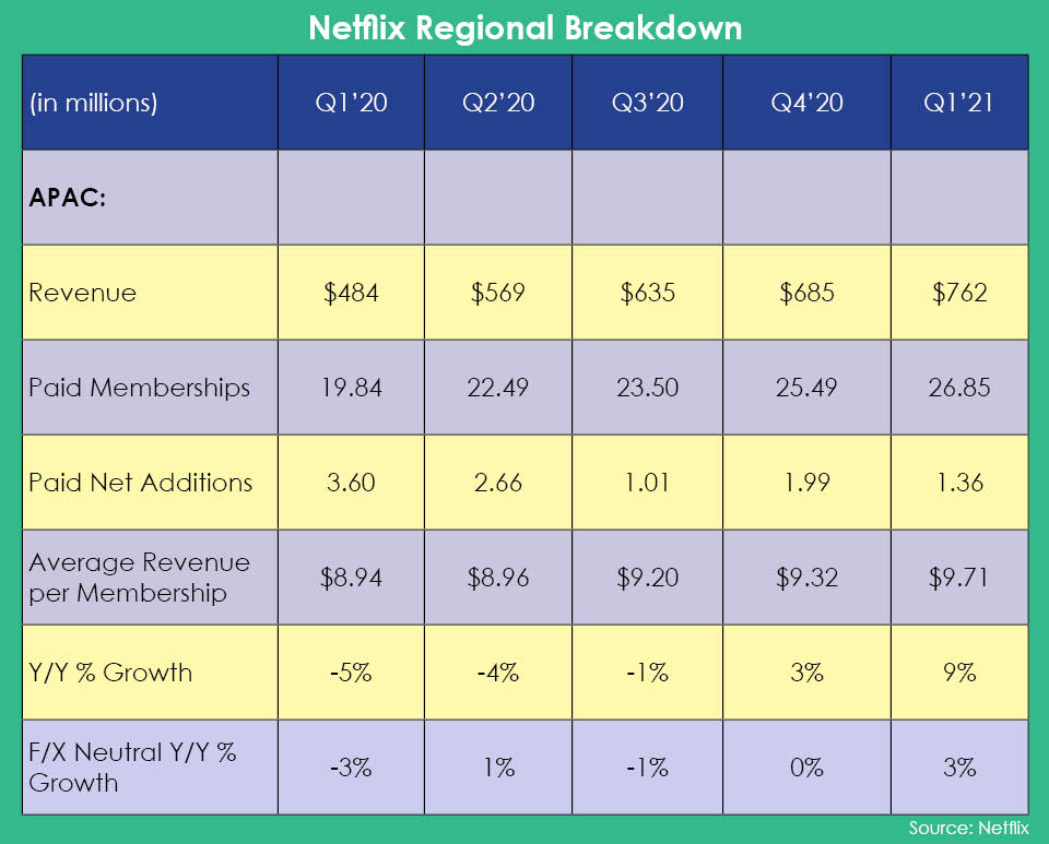 Netflix increased paid memberships in the Asia Pacific region to 26.85 million in the first quarter of this year, with average revenue per membership…