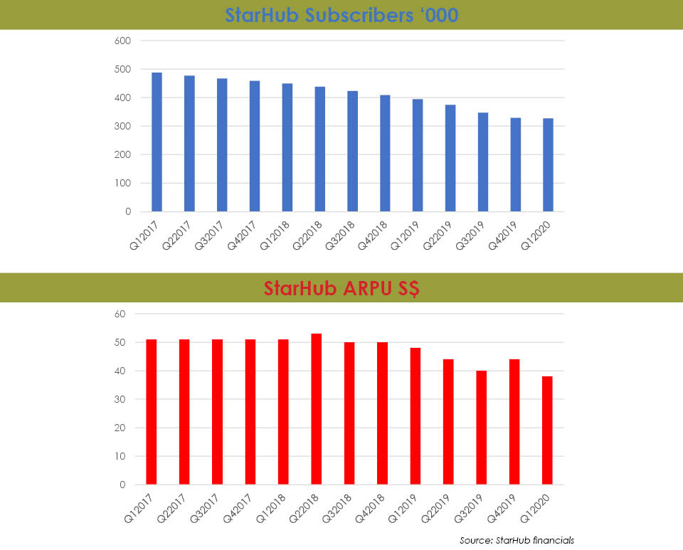 StarHub’s pay-TV base continues to slide along with average revenue per user, hitting three year lows at the end of Q1 2020.
